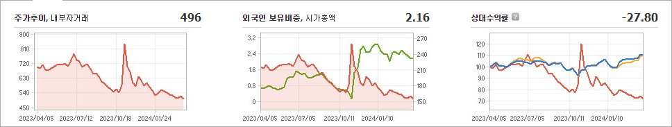 코아스의 현재 주가는 496원이며 전일 대비 -5.70원의 하락세를 보이고 있습니다. 주주현황을 살펴보면 노재근(외 3인)이 지분의 29.27%를 소유하고 있습니다. 코아스는 내구소비재 기업으로 장중 기준으로 주가는 496원입니다. 시가 총액은 151억 원이며 발행 주식수는 30,907,210주입니다. 외국인 보유 비중은 2.16%이며 장중 거래량은 135,743주를 기록했습니다. 또한, 코아스의 매출액은 737억 원을 달성했습니다.